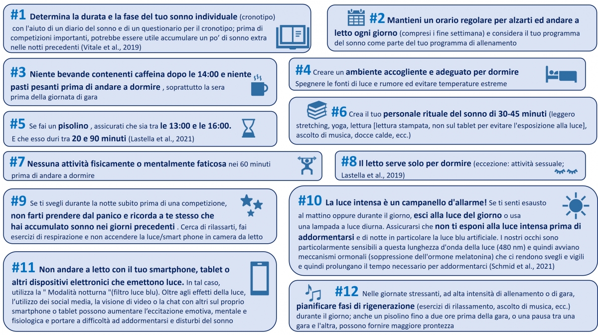 È degno di nota che recenti studi hanno dimostrato che l'adozione di strategie individualizzate di igiene del sonno può portare a un miglioramento del tempo totale di sonno e a una riduzione della latenza del sonno (ossia il tempo necessario per addormentarsi dopo essere andati a letto) negli atleti e nelle atlete di livello olimpico (Pasquier et al., 2023; Vitale et al., 2023). Le regole di igiene del sonno illustrate nella Figura 2 dovrebbero essere seguite in particolare dagli atleti olimpici e dalle atlete olimpiche. Se un/a atleta lamenta problemi di sonno per più di quattro settimane, è consigliabile consultare un medico per verificare la presenza di disturbi clinici del sonno. In caso di sospetto di un disturbo del sonno organico, come un disturbo respiratorio correlato al sonno, è necessaria una polisonnografia professionale in un laboratorio del sonno.