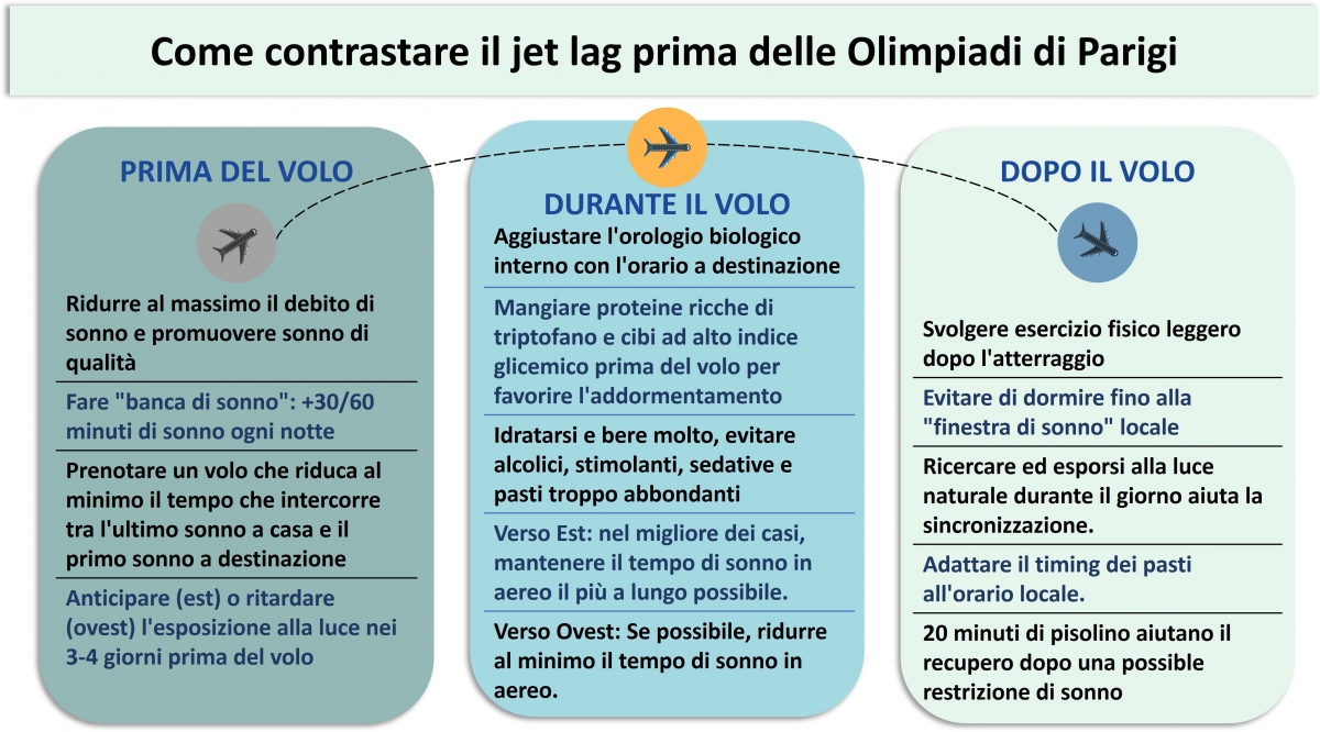 Il jetlag è un disturbo temporaneo del sonno che si verifica quando il ritmo circadiano interno è disallineato a causa di viaggi transmeridiani. Il disturbo si caratterizza per vari gradi di difficoltà ad addormentarsi o a mantenere il sonno, sonnolenza diurna eccessiva, ridotta allerta e performance durante il giorno, e sintomi vegetativi come cambiamenti dell'appetito e aumento della frequenza di risvegli notturni per urinare. Oltre a disturbare il ciclo sonno-veglia, anche altre funzioni corporee soggette ai ritmi circadiani, come la temperatura corporea e la digestione, possono essere influenzate. Si possono inoltre verificare sintomi quali mal di testa e vertigini. Iga Swiatek, numero uno mondiale ATP, condivide il suo segreto per gestire il jetlag: a volte, quando viaggia dall'Australia al Medio Oriente e poi negli Stati Uniti, va tutto bene, ma quando torna in Europa, o quando va dagli Stati Uniti alla Cina, è molto difficile. 'Andando da ovest a est, ho solo bisogno di un piccolo aiuto come la melatonina.' Anche il suo psicologo dello sport la sta aiutando, fornendole lampade di differenti intensità luminose. Queste lampade aiutano Iga a mantenere un ciclo di 24 ore e un buon ritmo del sonno. Descrive anche come mantenere una routine di allenamento la aiuti a ritrovare un buon ciclo sonno-veglia: 'Quando mi alleno, è molto più facile superare il momento. A volte, come dopo gli US Open, ho avuto una settimana libera ed è stato molto più difficile tornare al ritmo'. Molti degli atleti e delle atlete che parteciperanno alle Olimpiadi di Parigi sperimenteranno sintomi di jetlag e quindi è consigliato seguire alcune linee guida per gestire i sintomi di jetlag e la fatica (van Rensburg et al., 2021; vedere Figura 1). La direzione del volo gioca un ruolo importante nello sviluppo dei sintomi di jetlag. In generale, i voli verso ovest, che allungano il giorno, sono meglio tollerati dal corpo rispetto ai voli verso est, che accorciano la giornata. Questo perché il nostro orologio interno non funziona esattamente a un ritmo di 24 ore al giorno, ma in fasi orarie leggermente più lunghe. I voli verso ovest sono quindi più adattabili all'orologio interno. Ad esempio, se si vola da Parigi in Francia a San Francisco negli USA e si atterra alle 18:00, sarà mezzanotte in Francia. Se rimani sveglio per alcune ore in più, andrai a letto molto stanco ed esausto, ma ti adatterai bene al nuovo ritmo sonno-veglia. D'altra parte, se voli da San Francisco a Parigi e arrivi alle 18:00, il tuo corpo è ancora abituato all'ora di San Francisco (sono solo le 12:00 qui). Ecco perché di solito è più difficile addormentarsi in poche ore. Più fusi orari attraversi, più gravi sono i sintomi. In generale, puoi aspettarti di impiegare circa un giorno per adattarti a ciascun fuso orario, a seconda della tua salute e dell'età, così come della tua esperienza di viaggio e del tuo cronotipo. Agli atleti e alle atlete, in particolare a quelli/e che devono cambiare frequentemente fuso orario, si consiglia di adattarsi all'orario del paese di destinazione il prima possibile. Con una differenza di tempo di 6 ore, idealmente dovresti arrivare almeno 6 giorni prima della competizione. Se ciò non è possibile, puoi prendere alcune precauzioni nel tuo paese di origine. Per i voli verso est, dovresti anticipare l'orologio interno di 3-4 giorni prima di viaggiare (ad esempio, andare a letto e alzarsi un'ora prima). Per i voli verso ovest vale l'opposto. Un adeguamento precoce, utilizzando l'esposizione programmata alla luce (ad esempio, stimolazione luminosa con una lampada da giorno) per sopprimere la secrezione di melatonina e facilitare al contempo la veglia, può essere utile. Si dovrebbe cercare luce nelle prime ore della sera ed evitarla nella seconda metà della notte e nel primo mattino. Gli occhiali da sole possono essere utilizzati per ridurre l'esposizione alla luce. È consigliabile prenotare un volo che arrivi nel pomeriggio, così da poter andare a dormire in un orario prevedibile. Si raccomanda di regolare gli orologi all'ora del paese di destinazione e di adeguare il proprio comportamento a quest'ultima durante il volo. Ad esempio, molte compagnie aeree ora servono i pasti in linea con queste raccomandazioni. È importante rimanere idratati durante il volo, ma evitare la caffeina. Una volta arrivati a destinazione, un breve pisolino (20 minuti o meno) può aiutare a recuperare dalla privazione del sonno. La luce naturale è sempre da preferire a quella artificiale e aiuta a regolare il ciclo sonno-veglia. Per strategie specifiche di gestione del jet lag prima, durante e dopo il volo si rimanda alla Figura 1. Esistono numerose tattiche per mitigare il jet lag e lo stress da viaggio, le quali variano a seconda del punto di partenza e delle risorse disponibili. Pur essendo difficile riassumere tutte queste strategie in una singola illustrazione, abbiamo evidenziato alcune chiavi essenziali. Queste possono variare a seconda di fattori come la durata del viaggio o l'ora di partenza. Tuttavia, è sempre consigliabile consultare un coach del sonno professionale per ottenere una guida personalizzata prima di viaggiare!