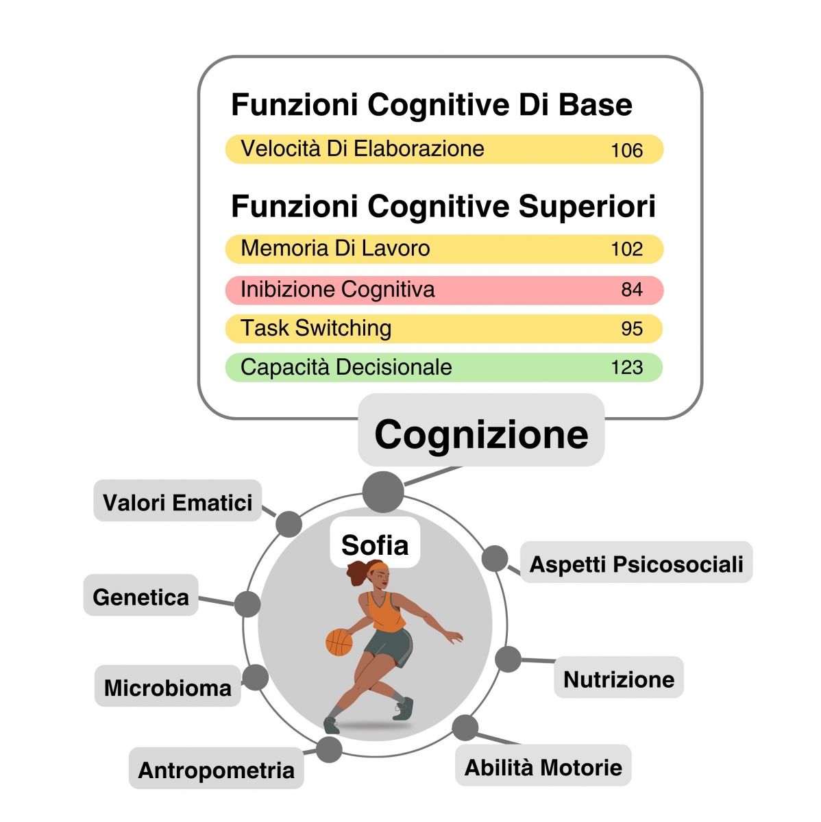 Soprattutto negli sport intercettivi e di squadra, è stato dimostrato che la cognizione svolge un ruolo centrale nello sviluppo di competenze sportive straordinarie (Kalén et al., 2021). Di seguito, prendiamo come esempio la pallacanestro per comprendere meglio come la cognizione si intersechi con la competenza atletica. I giocatori e le giocatrici di pallacanestro devono costantemente prendere decisioni in una frazione di secondo e contemporaneamente eseguire movimenti fisici complessi. Durante una partita, importanti funzioni cognitive di base consentono di prestare attenzione alla posizione dei/lle compagni/e o di elaborare le informazioni in arrivo, come le indicazioni dell'allenatore. Le funzioni cognitive superiori comprendono anche il recupero e l'aggiornamento delle informazioni in memoria di lavoro, l'inibizione delle risposte e il task switching (il passaggio rapido ed efficiente da un compito cognitivo a un altro) quando le circostanze cambiano. Inoltre i giocatori e le giocatrici hanno bisogno di abilità cognitive specifiche, che permettano di anticipare il comportamento degli/lle avversari/e, valutare future strategie alternative di gioco e prendere decisioni in momenti di massima pressione (Figura 2). Seguiteci durante una giornata di allenamento speciale della cestista della nazionale olimpica, Sofia, che fa parte del progetto di ricerca interdisciplinare “in:prove”, volto a migliorare le prestazioni atletiche attraverso valutazioni e interventi individualizzati. Esploreremo insieme il ruolo della cognizione e della valutazione cognitiva.
